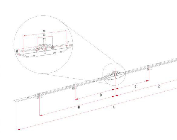 Cierre corredera con 2 bulones para series perimetrales de 600 mm de longitud para aguja de 7,5 mm y...