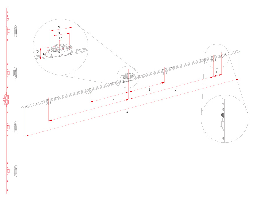 Cierre corredera con 3 bulones para series perimetrales de 1.600 mm de longitud para aguja de 7,5 mm y con...