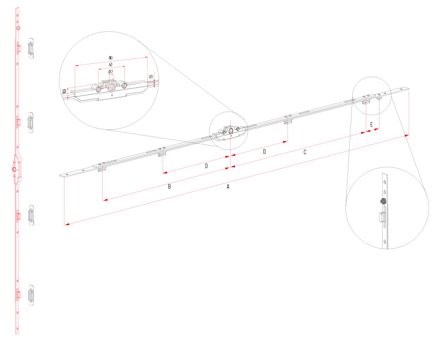 Cierre corredera con 3 bulones para series perimetrales de 1.600 mm de longitud para aguja de 7,5 mm y con cierre fabricando en Zamak.